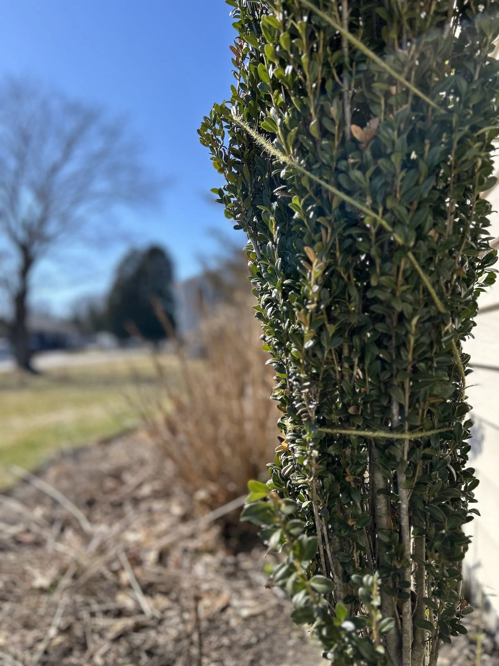 A few days ago, I tied up a few splayed branches of the pencil holly in the side bed. The lavender looks a little ragged after winter, but that’s not unusual this time of year.