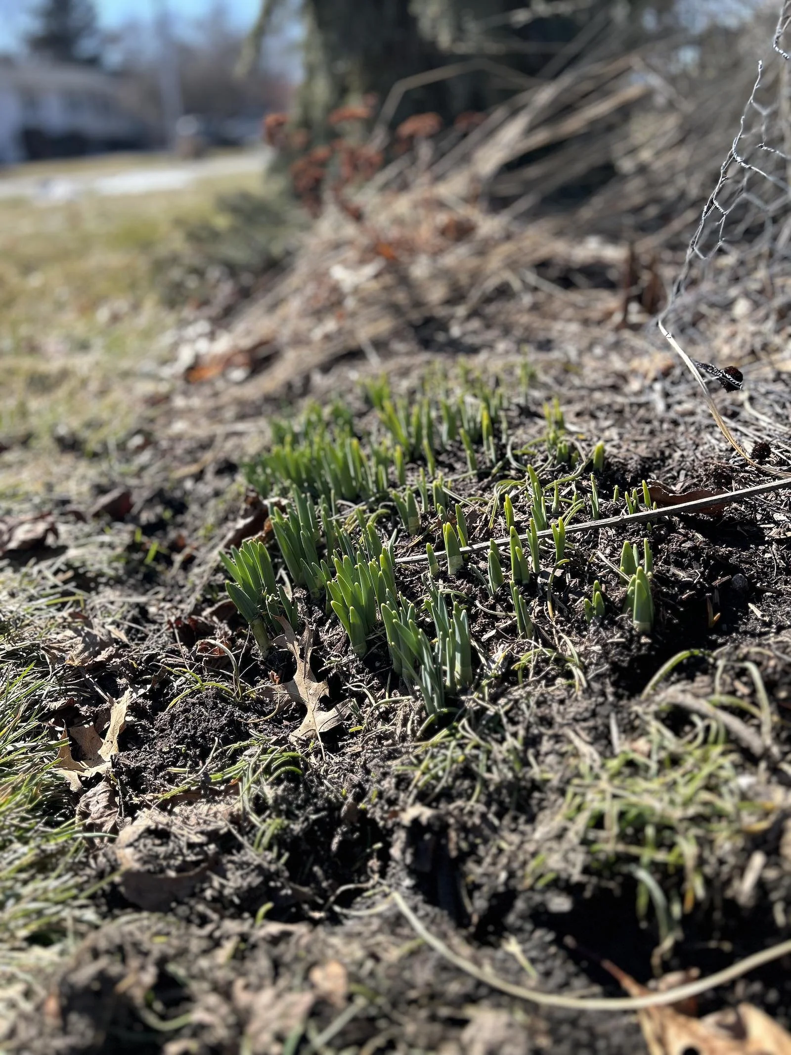 The daffodils I planted in clumps years ago have begun to spread, small colonies now pushing up through the soil.