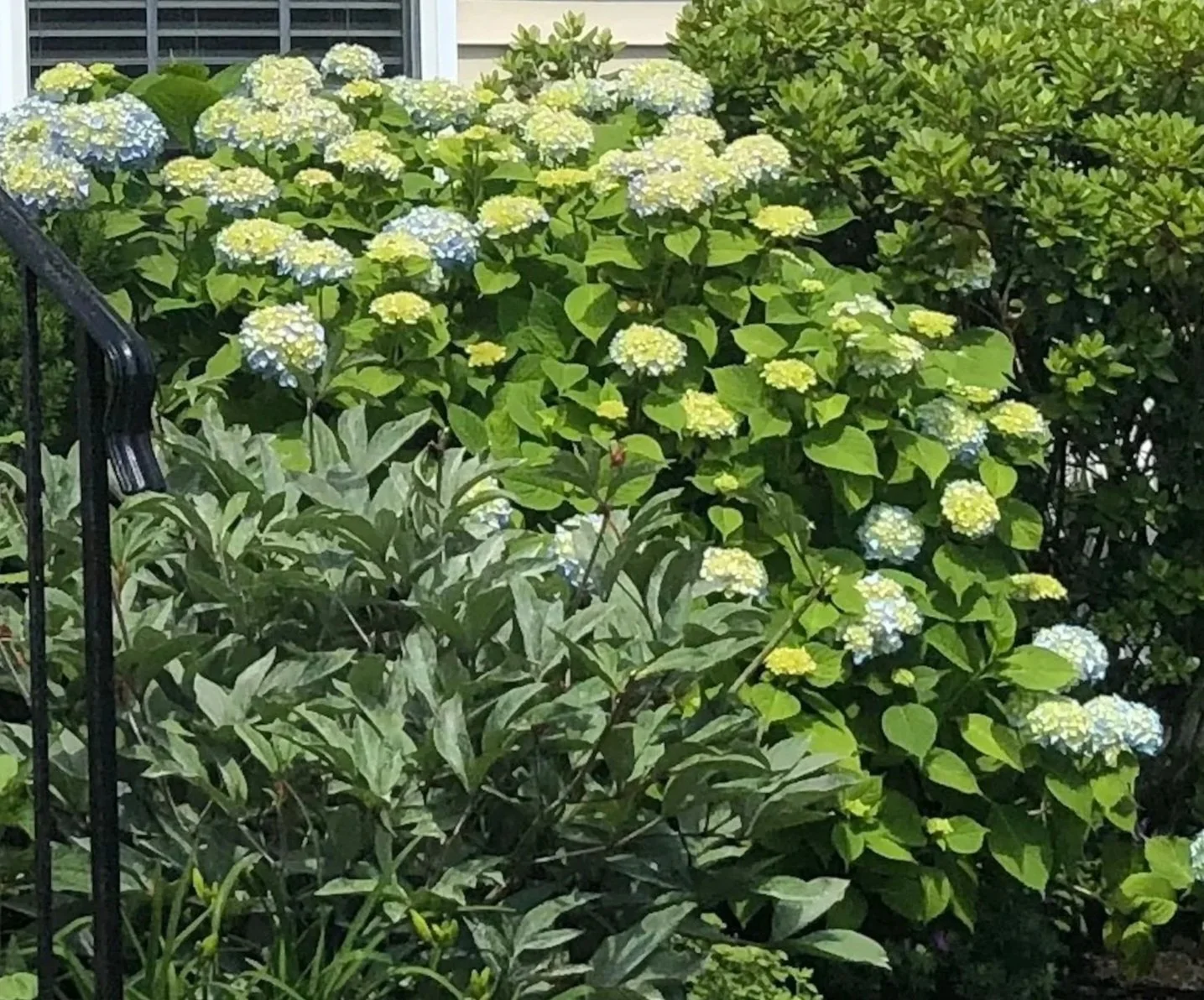 When we first moved in, a half dozen of traditional New England mophead hydrangeas, including a lacecap, were scattered along the foundation plantings of the house.