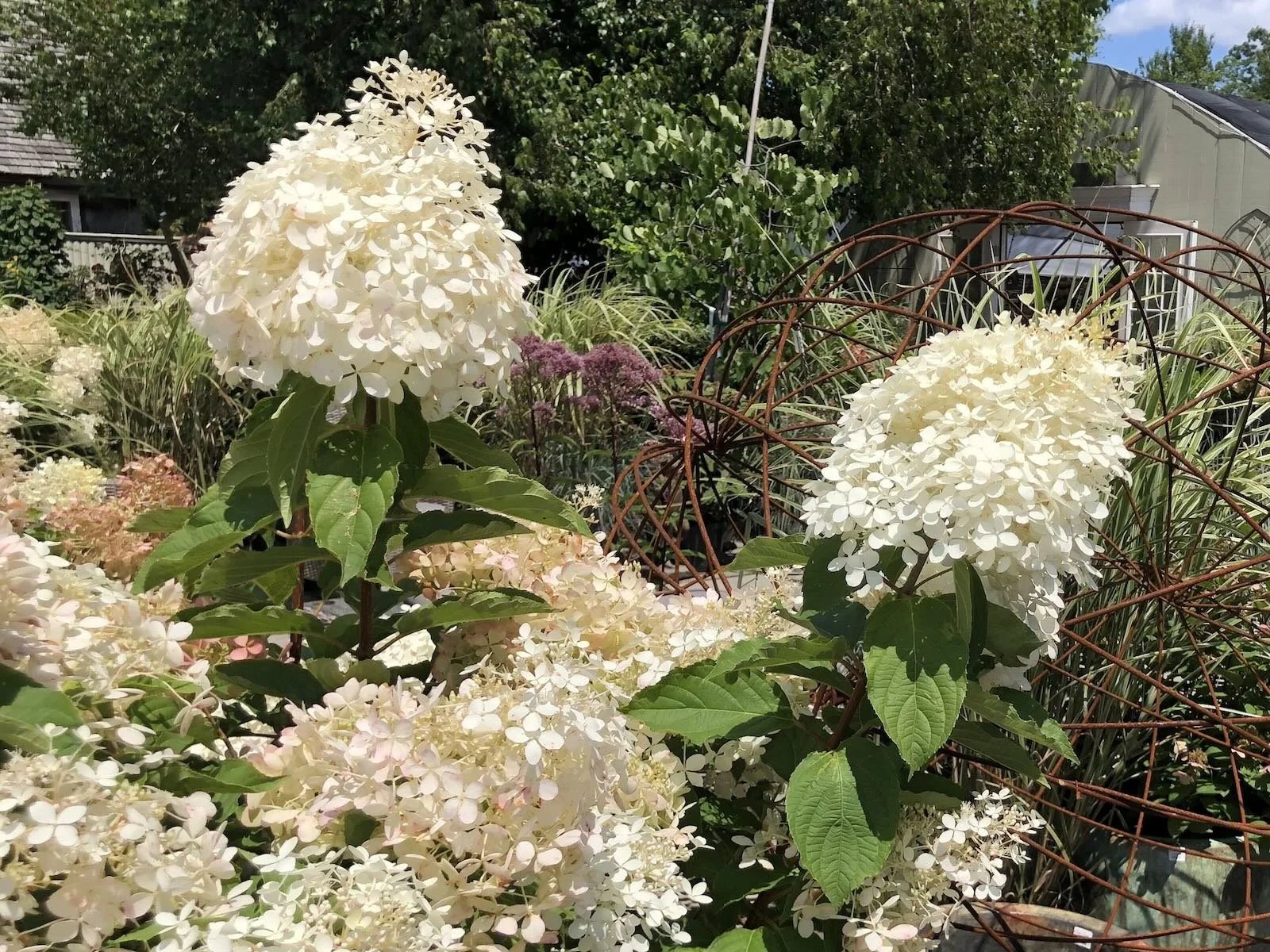 In my mostly sunny garden, my panicle hydrangeas thrive, blooming from mid-summer through fall, from June through October, emerging lime-green to white and fading into pinks, mauves, berries, and beiges as temperatures drop.