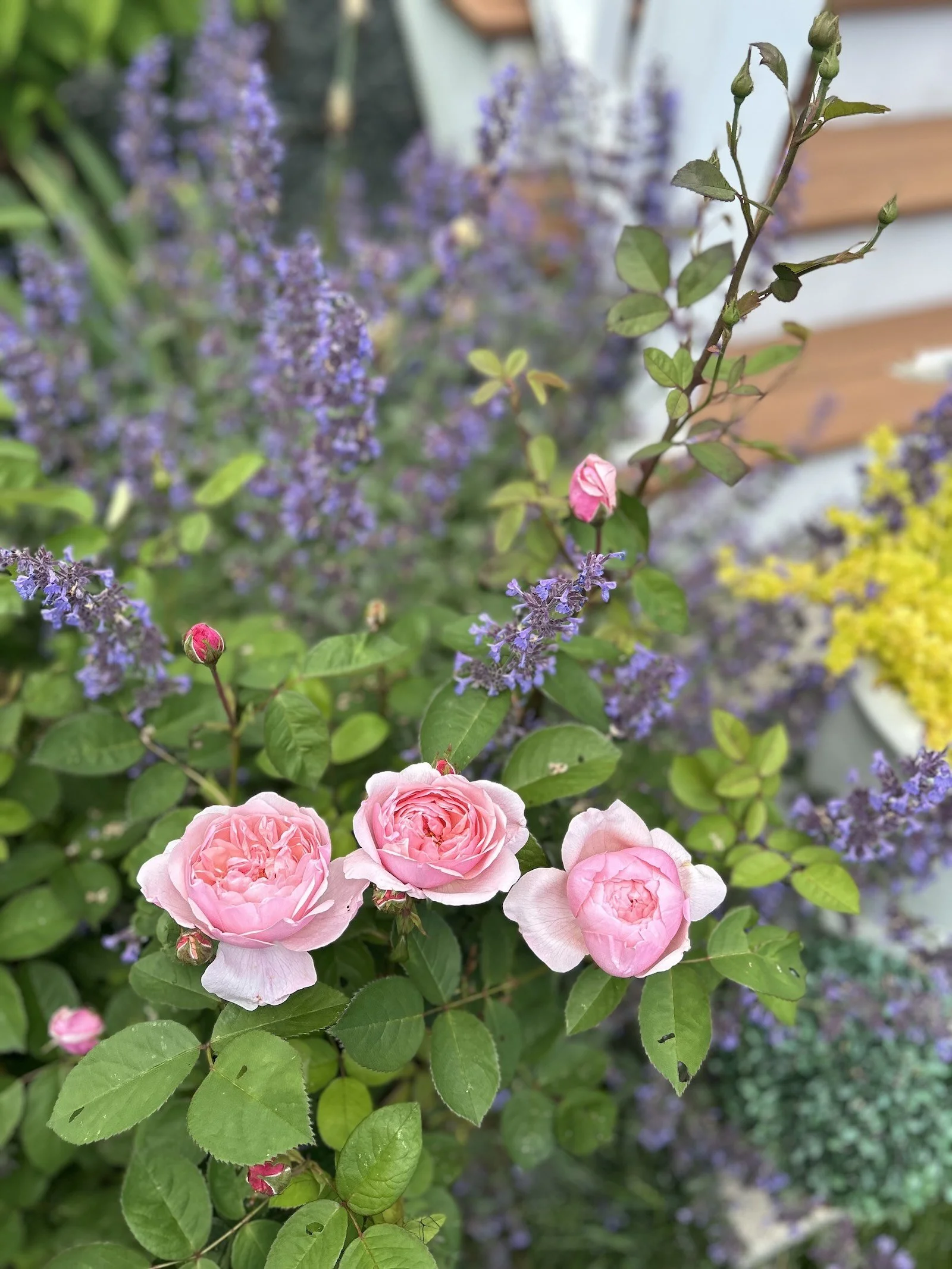 In my garden, Nepeta ‘Walker’s Low’ (Nepeta faassenii) camouflages the legs of my David Austin ‘Alnwick’ roses. Photo by Parsley & Petal.